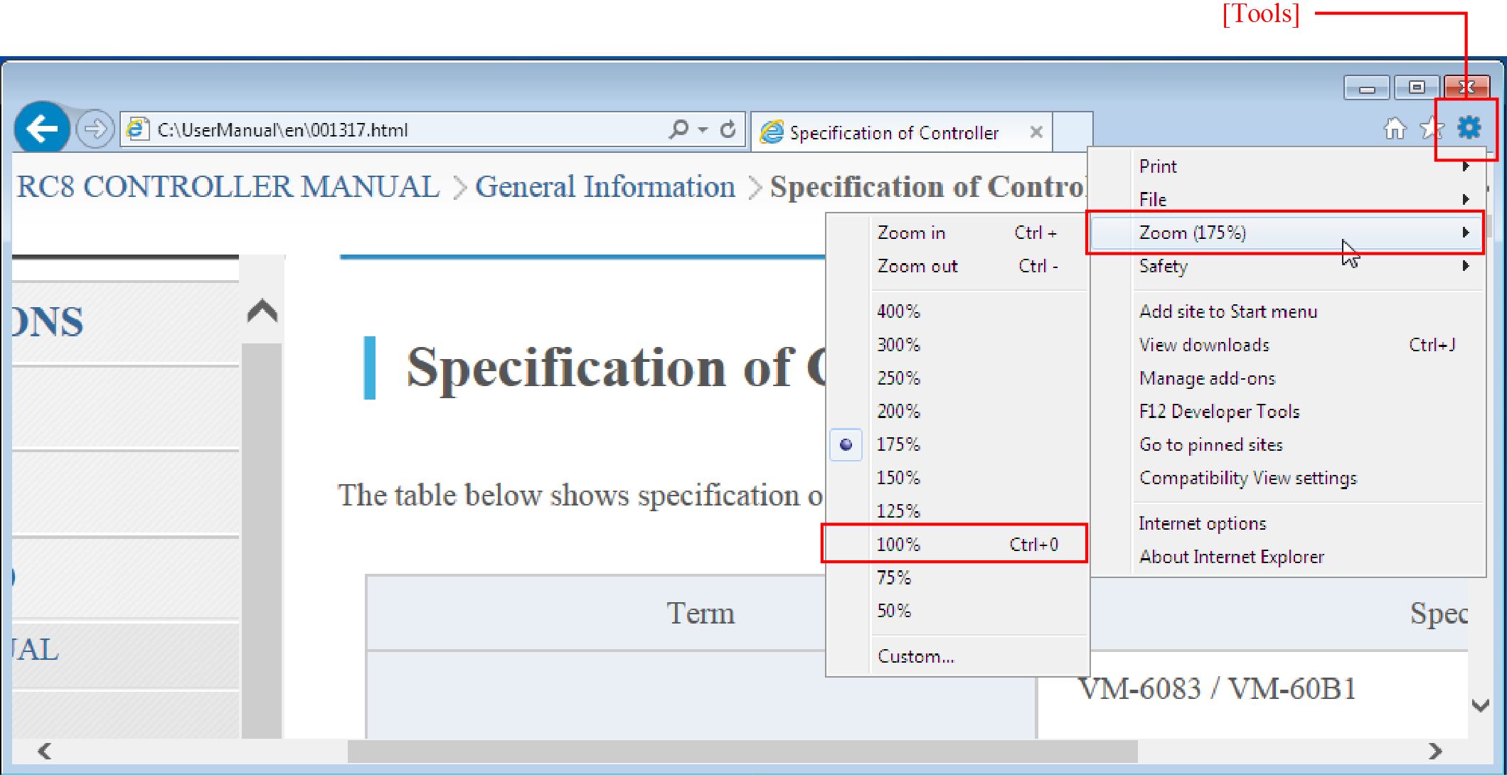 On the browser, click [Tools] button, click [Zoom], and then select [100%].