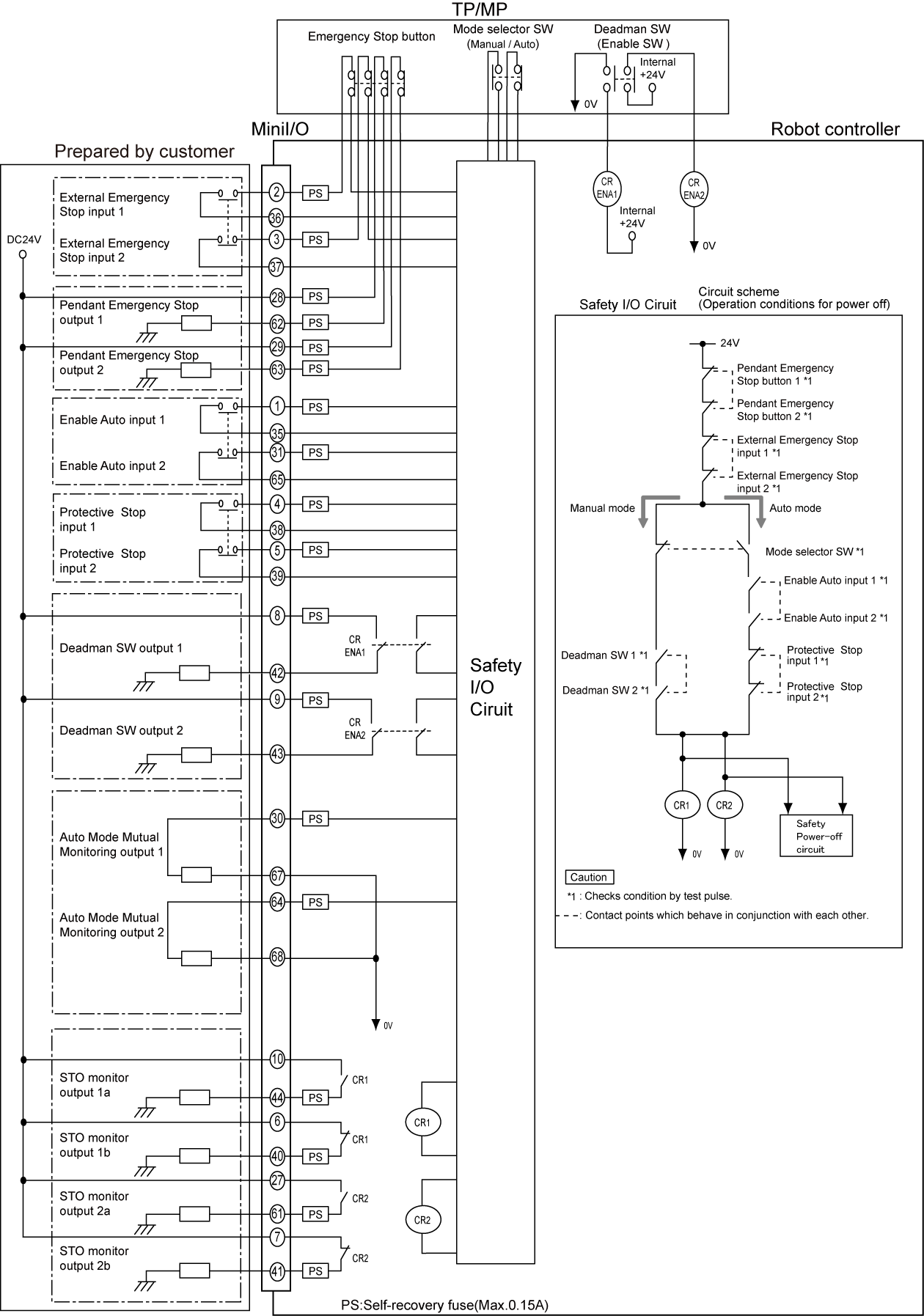 The figure below shows an internal connection equivalent circuit for the safety circuit in the controller. The actual safety circuit is configured with safety relays and others.