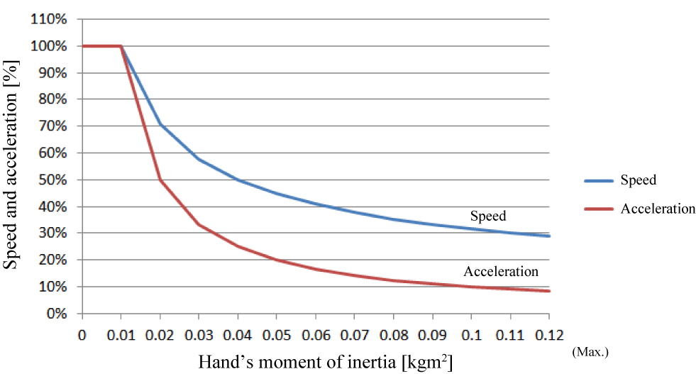 | Hand's or Tool's moment of inertia around the T axis ≦ Max. allowable moment of inertia (incl.work-piece). (refer to the graph below). |