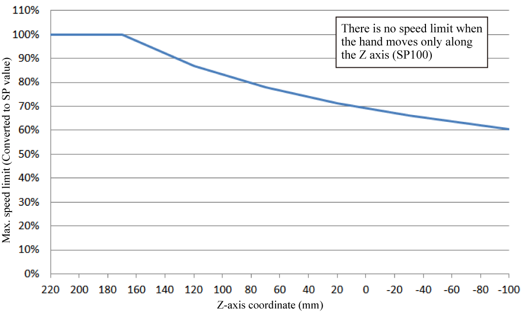 For example, when the robot arm moves by SP100 from the start point (Z-axis coordinate 220 mm) to the target point (Z-axis coordinated -100 mm), the maximum speed limits are as follows: 100% when Z-axis coordinate is 220 mm 60% when Z-axis coordinate is -100 mm
