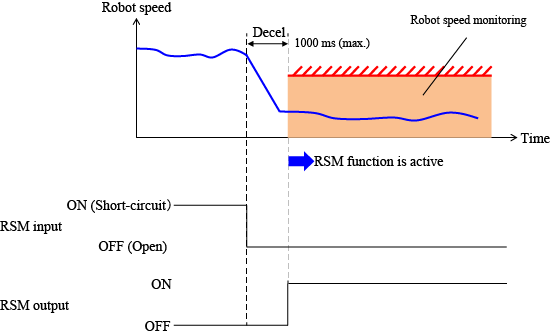 Signal name Robot motion speed limit RSM 1 input 125 mm/s RSM 2 input 250 mm/s RSM 3 input 500 mm/s - Under the Manual mode, any input of RSM input monitors if the robot motion speed remains below 250 mm/s.