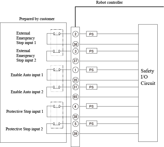 - Two Enable Auto inputs signals and/or two Protective Stop input signals must be controlled with separate contacts. Two Enable Auto circuits and/or two Protective Stop circuits connected in parallel using a single contact or always-shorted circuit will be interpreted as an external circuit failure, as a result, the robot cannot start operation.
