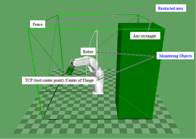 | Restricted area | Permanently | Fence model | Monitoring target is always monitored whether if it is within the permanently restricted area. This restricted area must enclose the robot. |