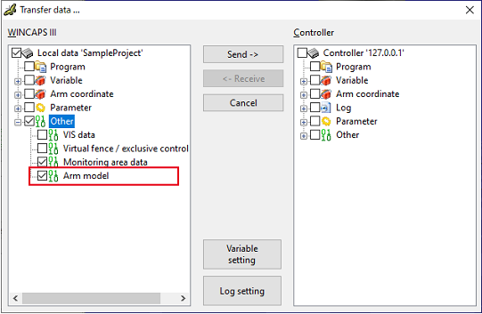 When you select the check box of "Arm model", you can send the creation source model data of the monitoring area data to the controller. However, if the storage area is insufficient in the controller, the item "Arm model" will not be displayed.