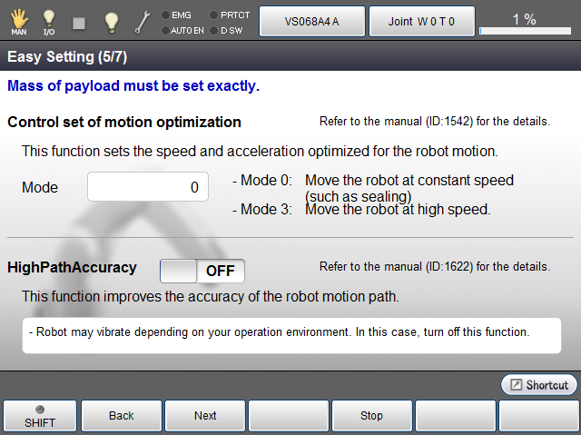Specify [Control set of motion optimization] and [HighPathAccuracy setting].