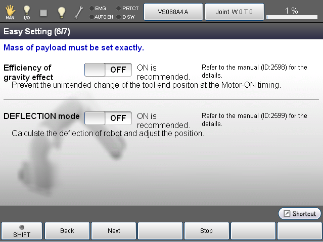 Robot can exert its highest performance with the settings optimized for the operation environment. With this Easy Setting, users can easily complete the robot settings suitable for the actual operation environment. (Ver.2.0.*or higher)