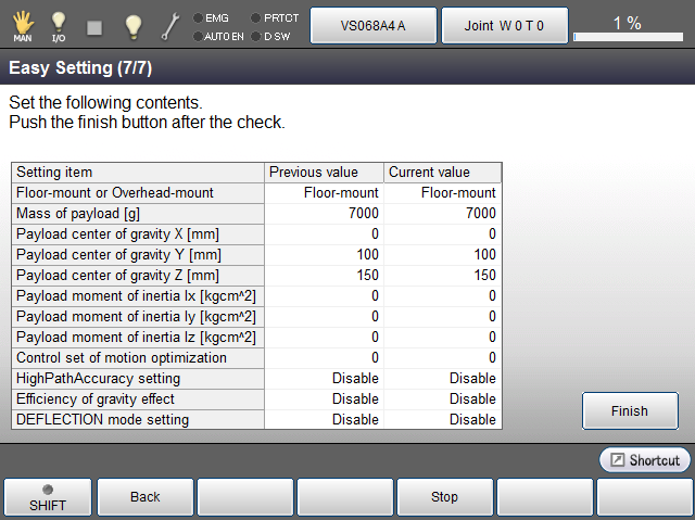 Check the settings you made and then press [Finish] to save setting values to the controller.