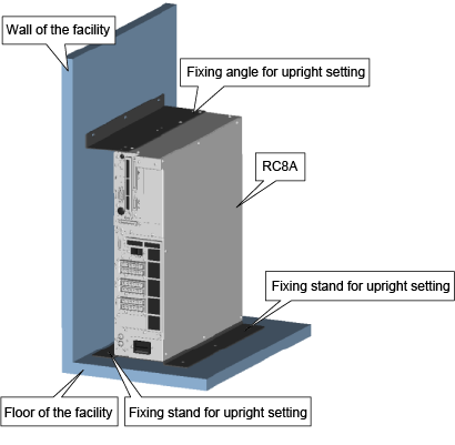 When placing the controller in the upright position, it is recommended to use customer-prepared parts to fix the controller to the wall and floor as shown below.
