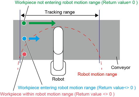 TrackMotionRange (Conveyor number, Target position [, Tool coordinate [, Work coordinate] ])