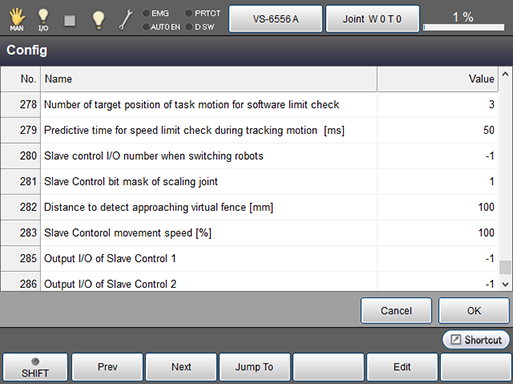 | 283 | Slave Control movement speed [%] (*1) | 100 | Set the motion speed when the slave robot follows the master robot. If the following speed is low, the slave robot motion may be unstable and may not be able to follow normally. |