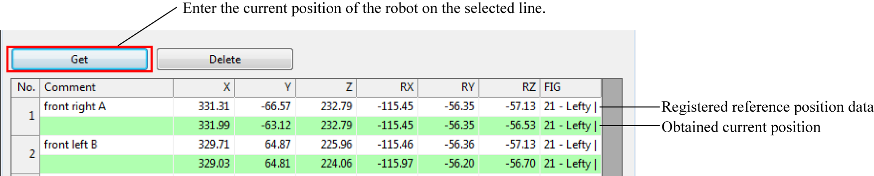 Select any position data that you have been registered beforehand and teach the same position, and then click [Get] to register.