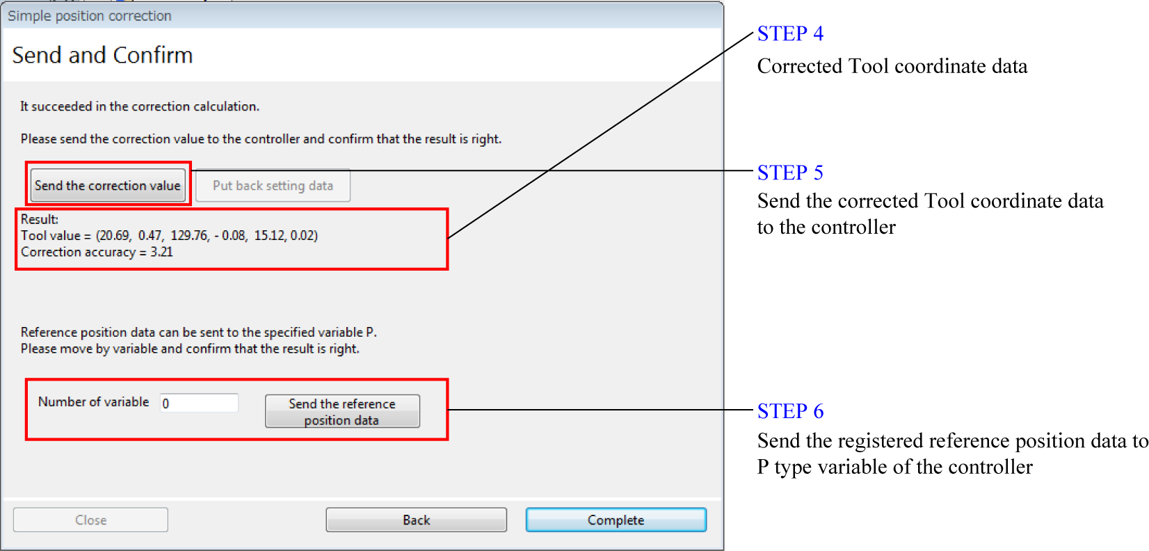 With a teach pendant, move the robot to the P type variable (reference position), check if the value has been corrected properly, and then click [Complete].