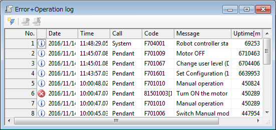 This window displays the content of error log and operation log in chronological order. For about content of each data, please refer to each log.
