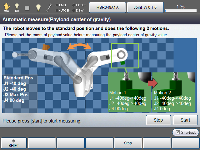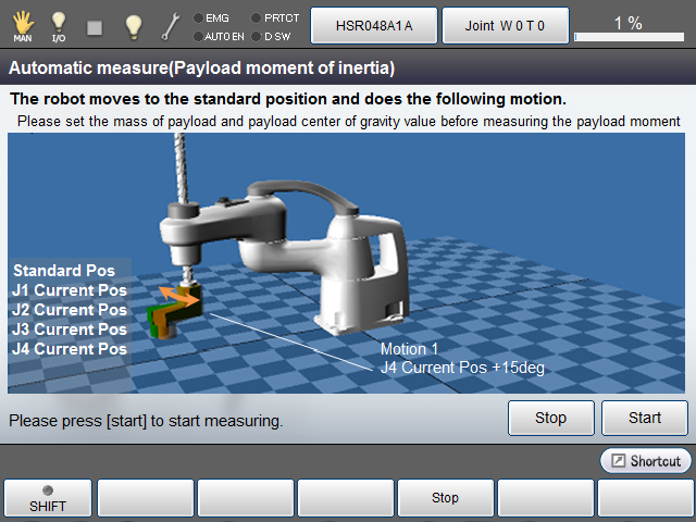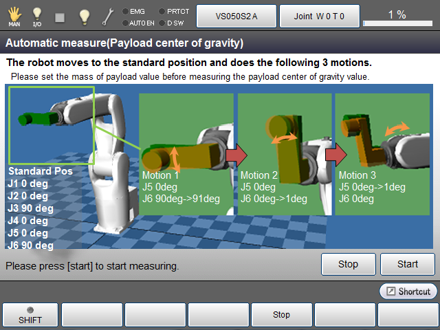 - When performing automatic measurement, be sure to execute measuring in the order of Mass of payload → Payload center of gravity → Payload moment of inertia. If performs in a different order, it may result in incorrect measurement values.