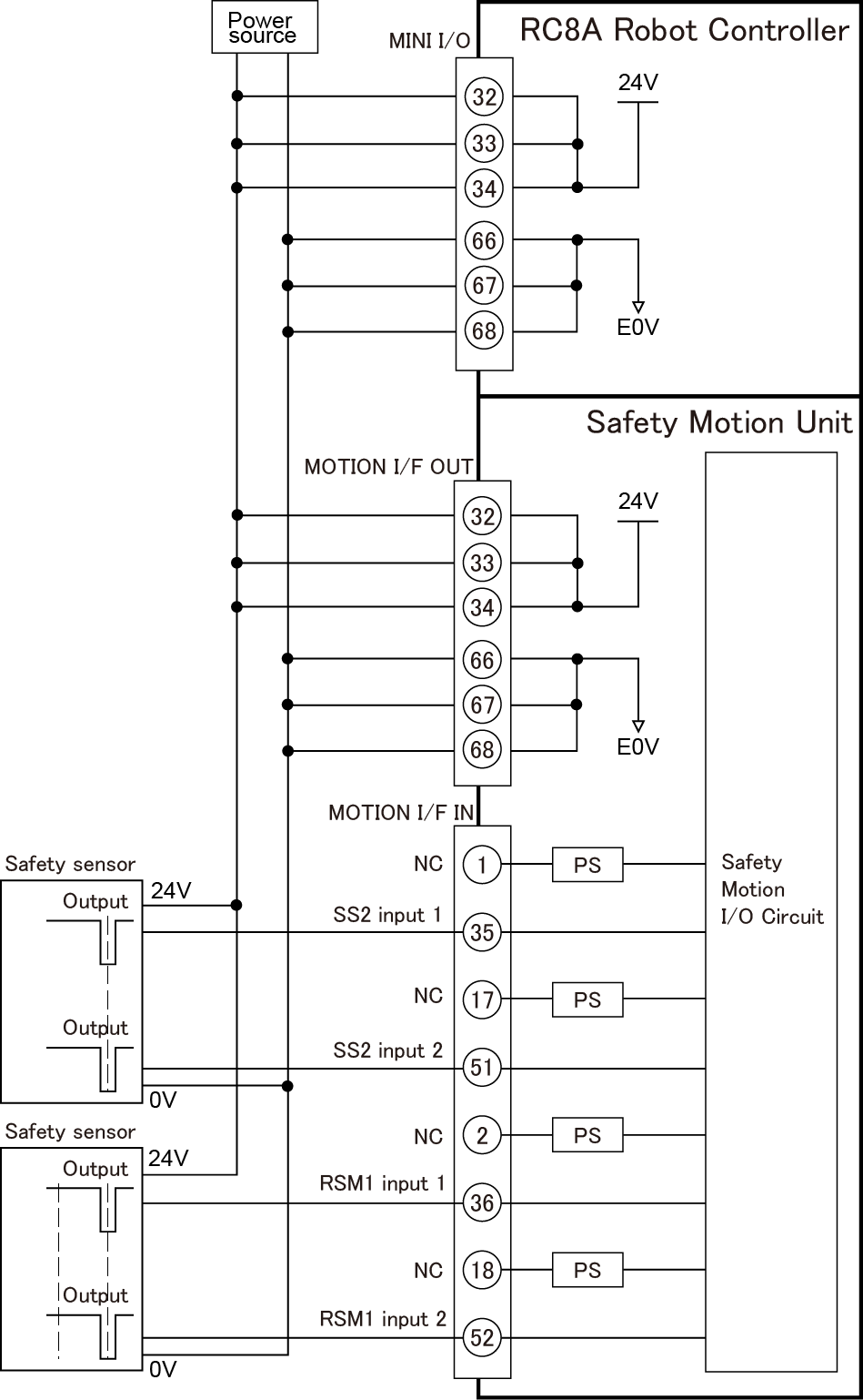 (*) Available only when the model of engine board mounted in the robot controller is "E" - Power-supply to the safety sensor should be supplied from the power-supply unit of Mini I/O and Motion I/O.