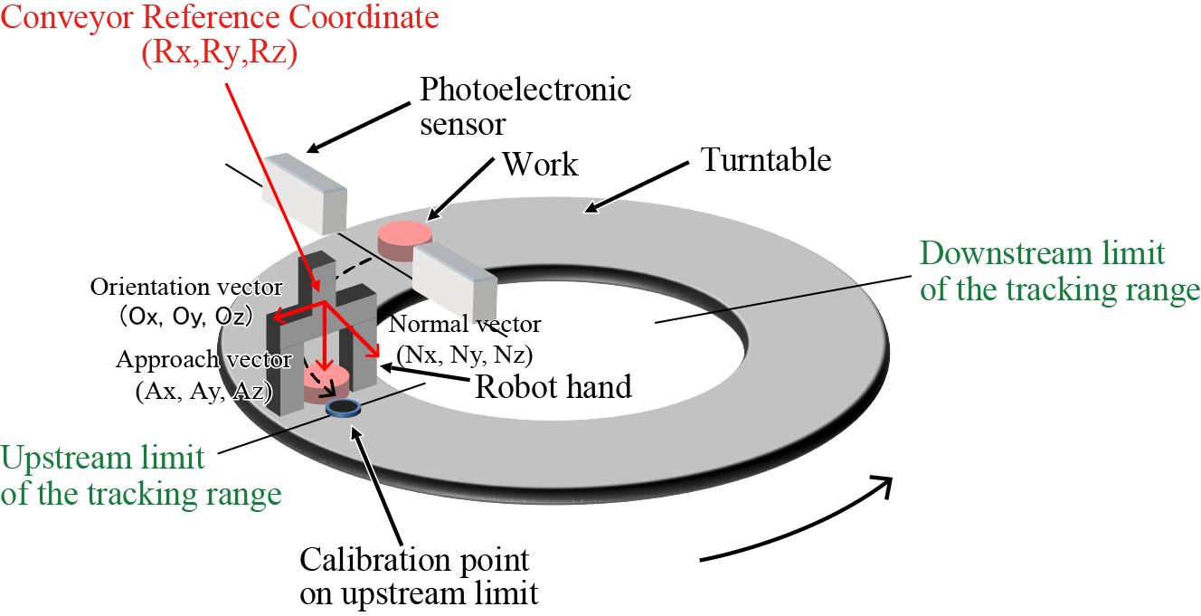 | Conveyor CALDATA(X, Y) | Rotating angle around the Z axis of the base coordinate that shows the direction of rotary axis of the turntable [rad] |
