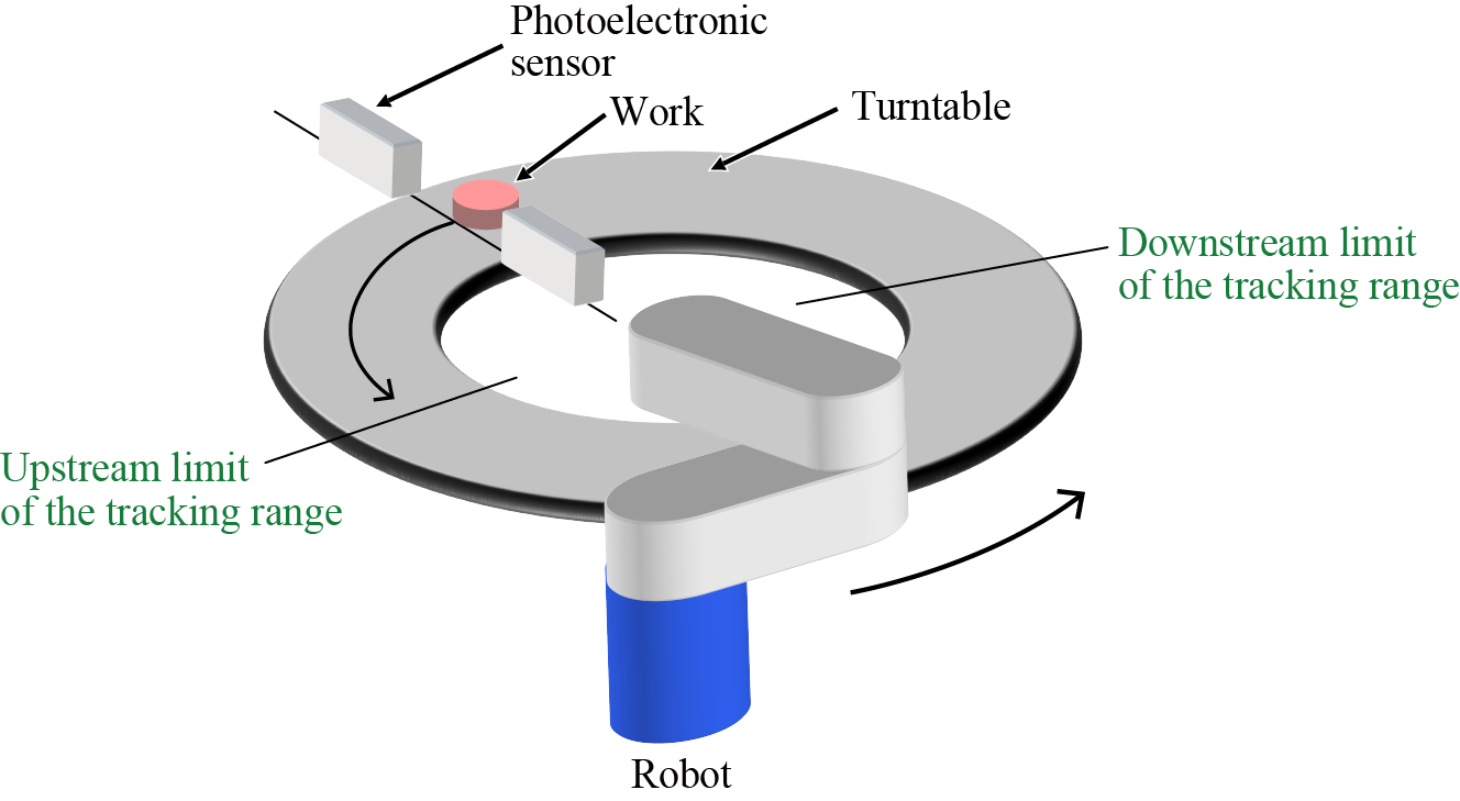 | Downstream limit of the Tracking range | Once a workpiece reaches this limit, robot stops the catch-up motion and starts deceleration. [mm] |