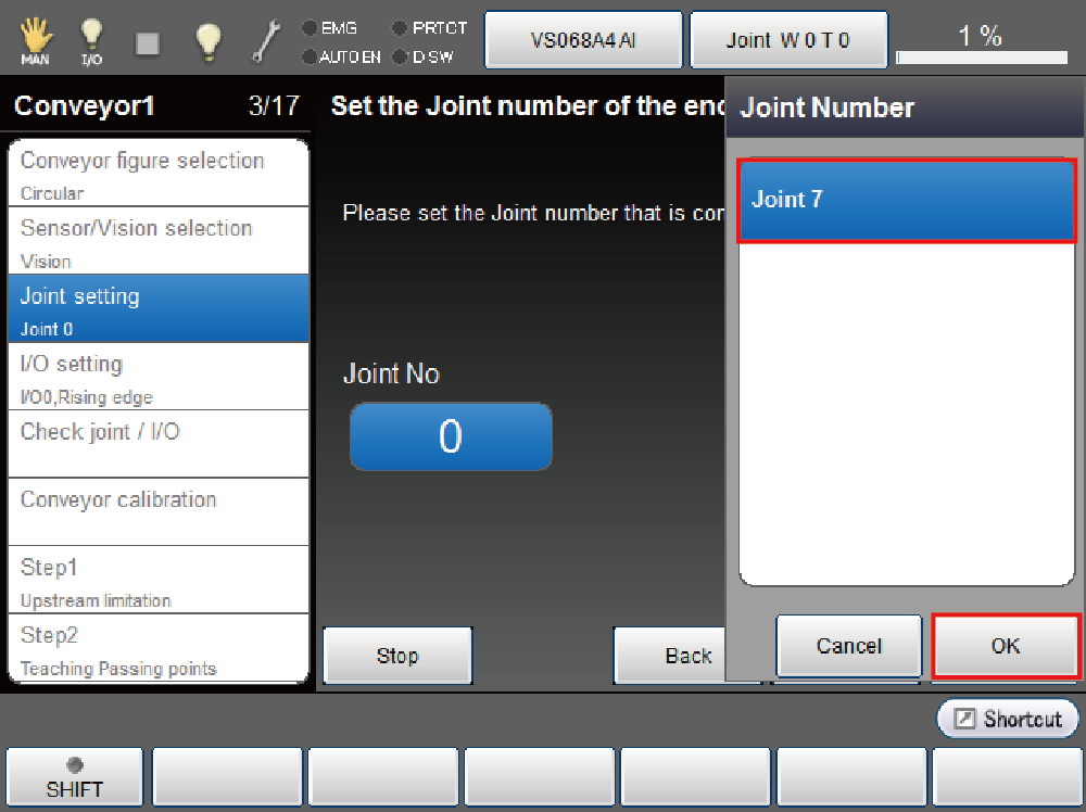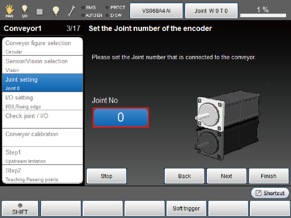 This section describes how to set the joint number of the encoder that is connected to the turntable on the "Conveyor setting" screen.