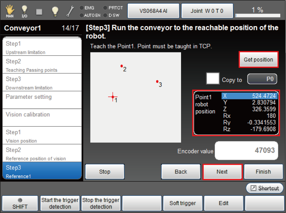 - Move back the reading position of reference point 1 in the opposite of the conveyor vector direction to get the vision sensor detection position.
