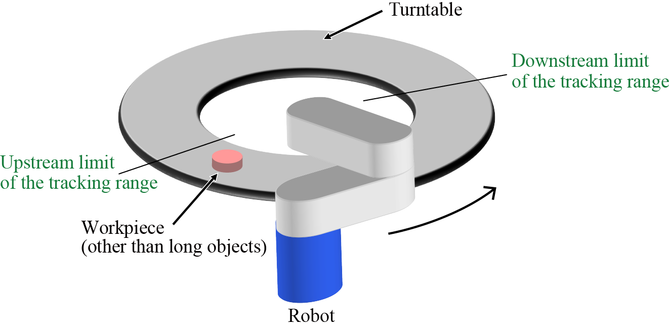 If the workpiece moves across the downstream limit of the tracking range before executing this command, an error will be issued.