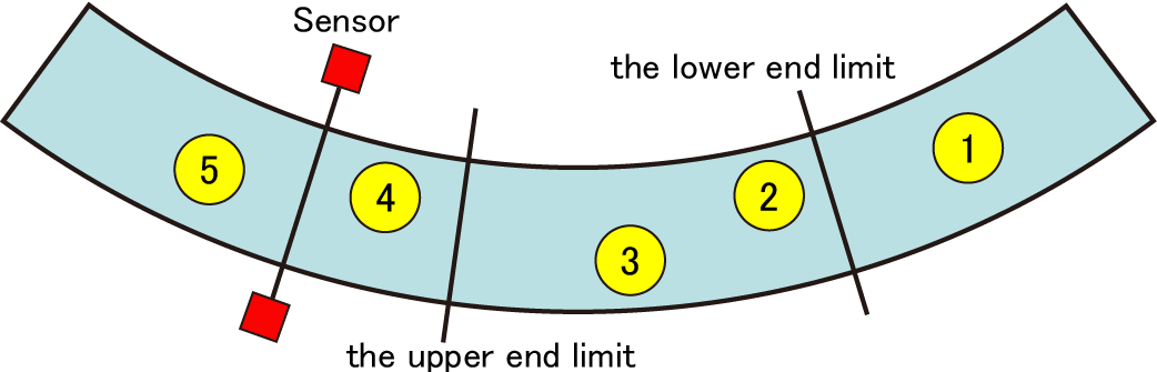 In the image below, there are five workpieces on the sensor tracing turntable. Workpieces are conveyed from the upstream to the downstream, in the order from the Work 1 to Work 5. Once a workpiece passes through the sensor, data of the workpiece will be recorded in the tracking buffer.