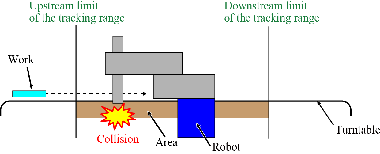 Please pay attention to avoid collisions with equipments placed behind the Downstream limit of the tracking range. It is recommended to perform collision check by using Area function to prevent unintended contact between robot and equipments.