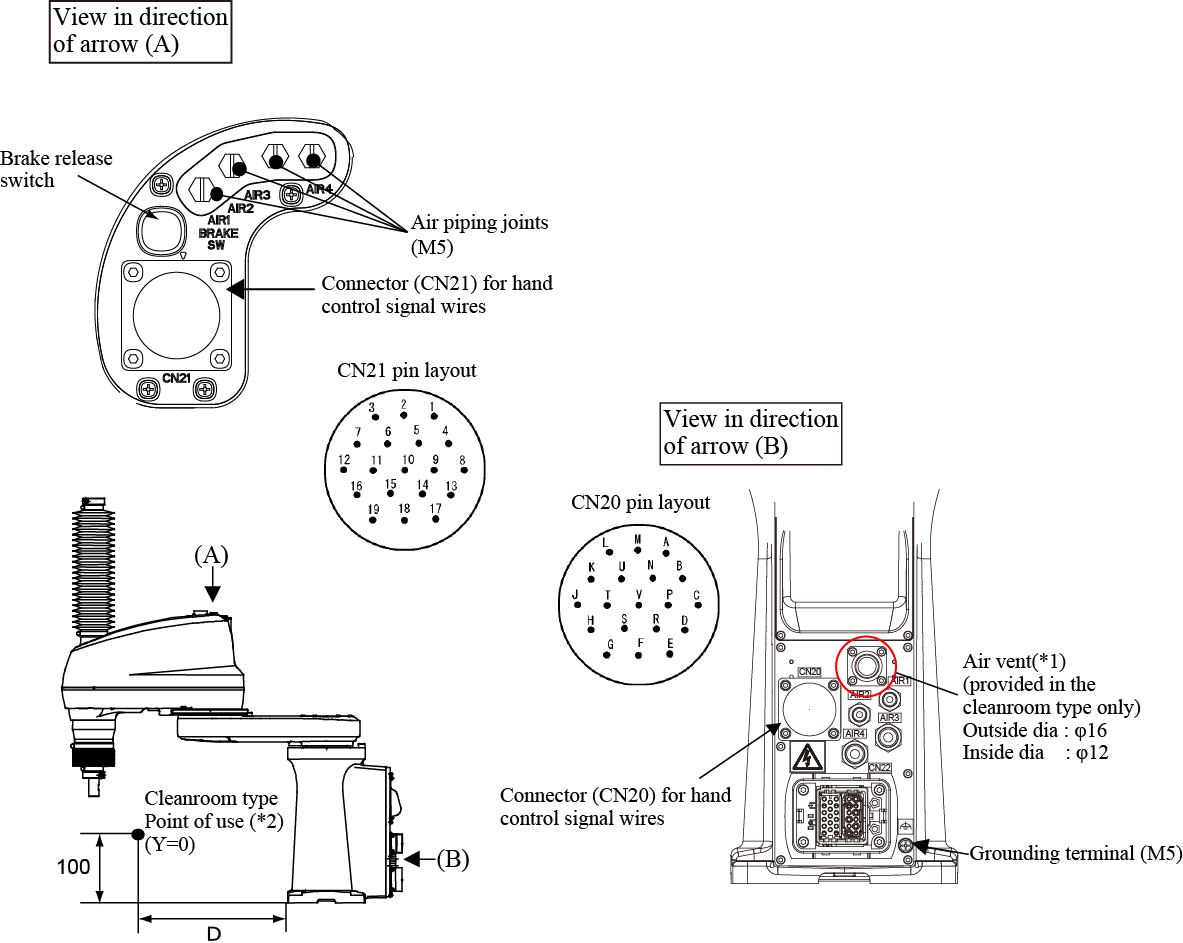 Notes for cleanroom type *1 Recommended suction air flow rate: 25 to 40 liters/min. Recommended blower: VFC068P (manufactured by Fuji Electric Motor Co., Ltd.) The cleanroom type requires ventilation inside the robot. Exhaust air from the air vent provided in the back of the robot base. *2 Dimension D at point of use HS035A1-N*C3: 250 mm HS045A1-N*C3: 350 mm HS055A1-N*C3: 400 mm |
