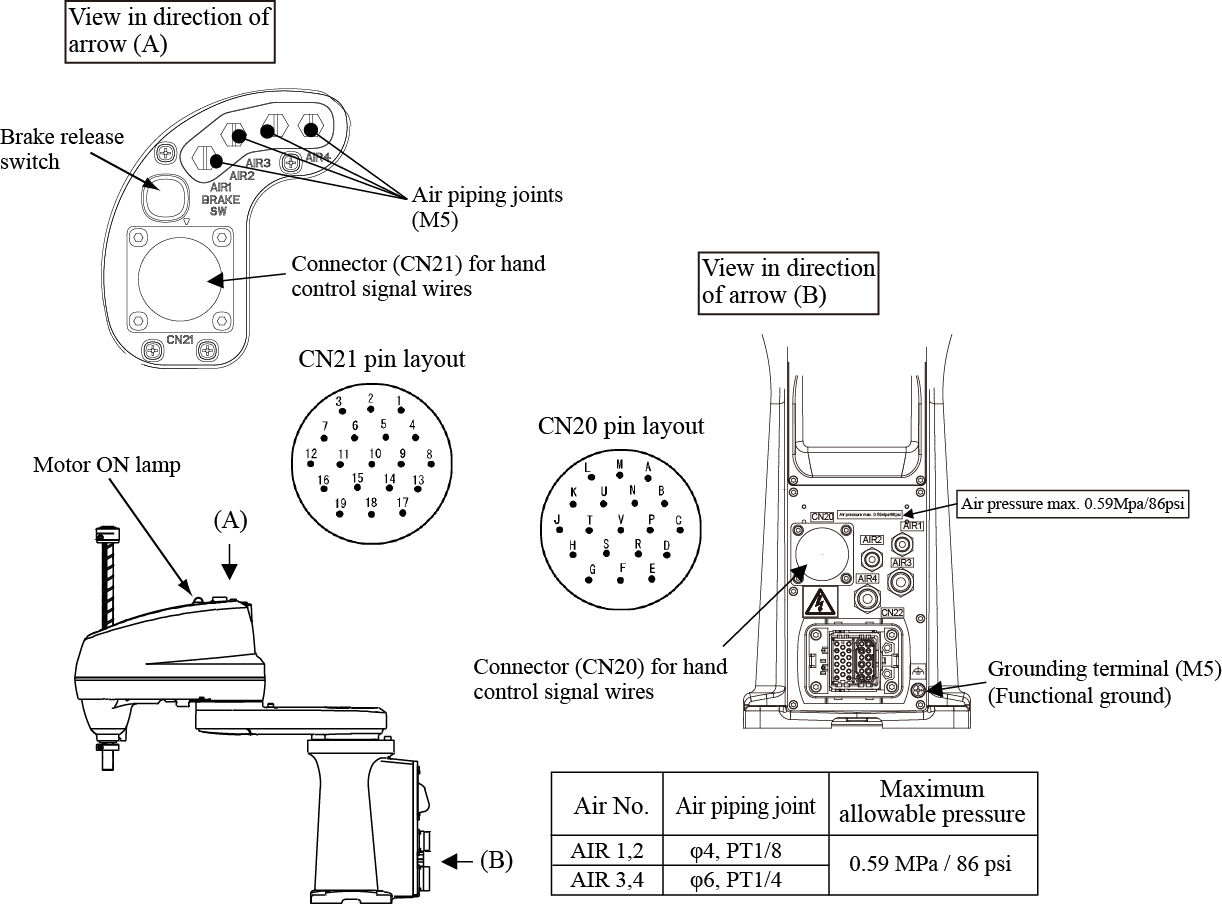 Note 1: Pins A to V on CN20 and pins #1 to #19 on CN21 are connected with each other as shown below. The maximum rated current per line is 1A.