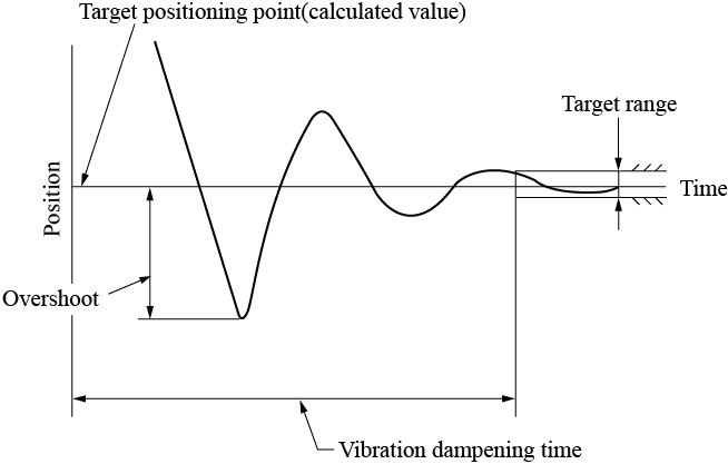 3. After the robot moves to and passes the target positioning point, vibration will be dampened and the robot positioned at the target positioning point as shown in Figure below. This vibration dampening time is not considered in the graph.
