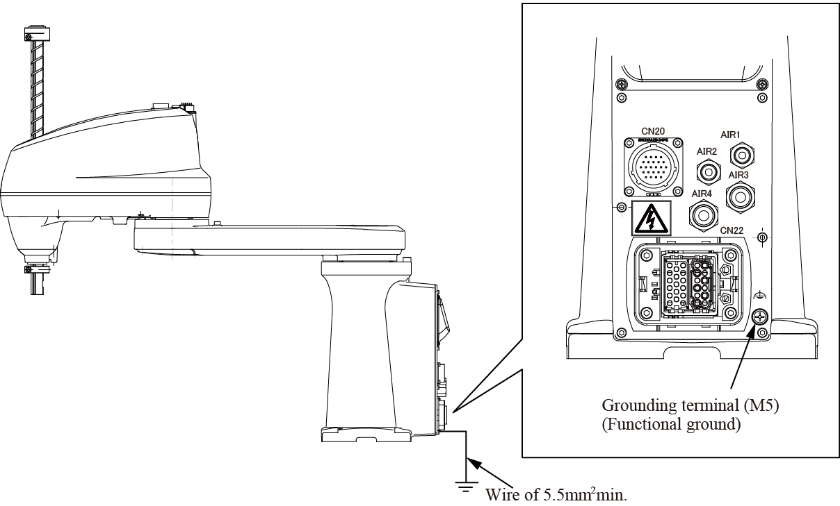Ground the grounding terminal of the robot unit using a wire of 5.5 mm2 or more.