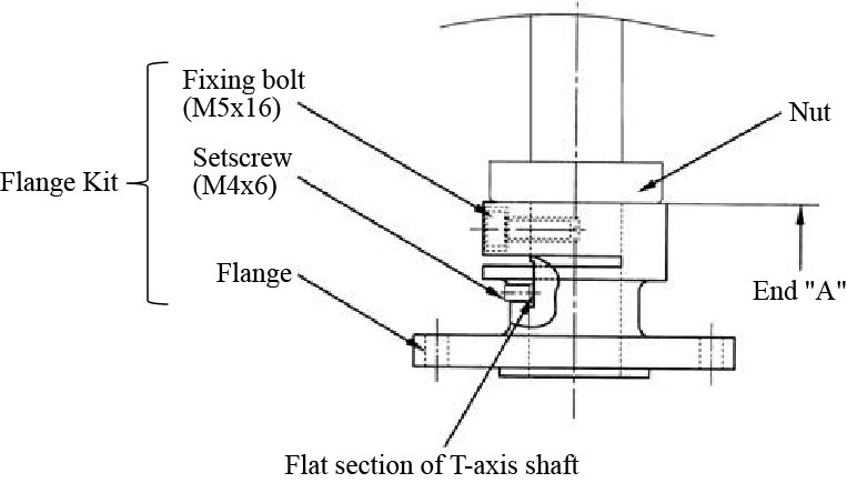 - Gradually tighten the setscrew until it comes into contact with the flat section of the T-axis shaft and the flange can be rotated without looseness. Then torque the setscrew to 1.6±0.3 Nm.