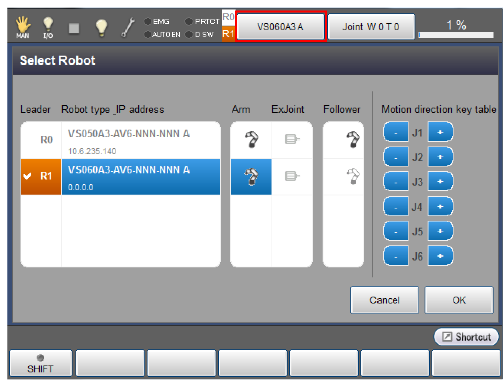 Click the robot selection button on the top of the window to display the [Select Robot] window. Click [R1] (a slave controller of cooperative control) and then click [OK].