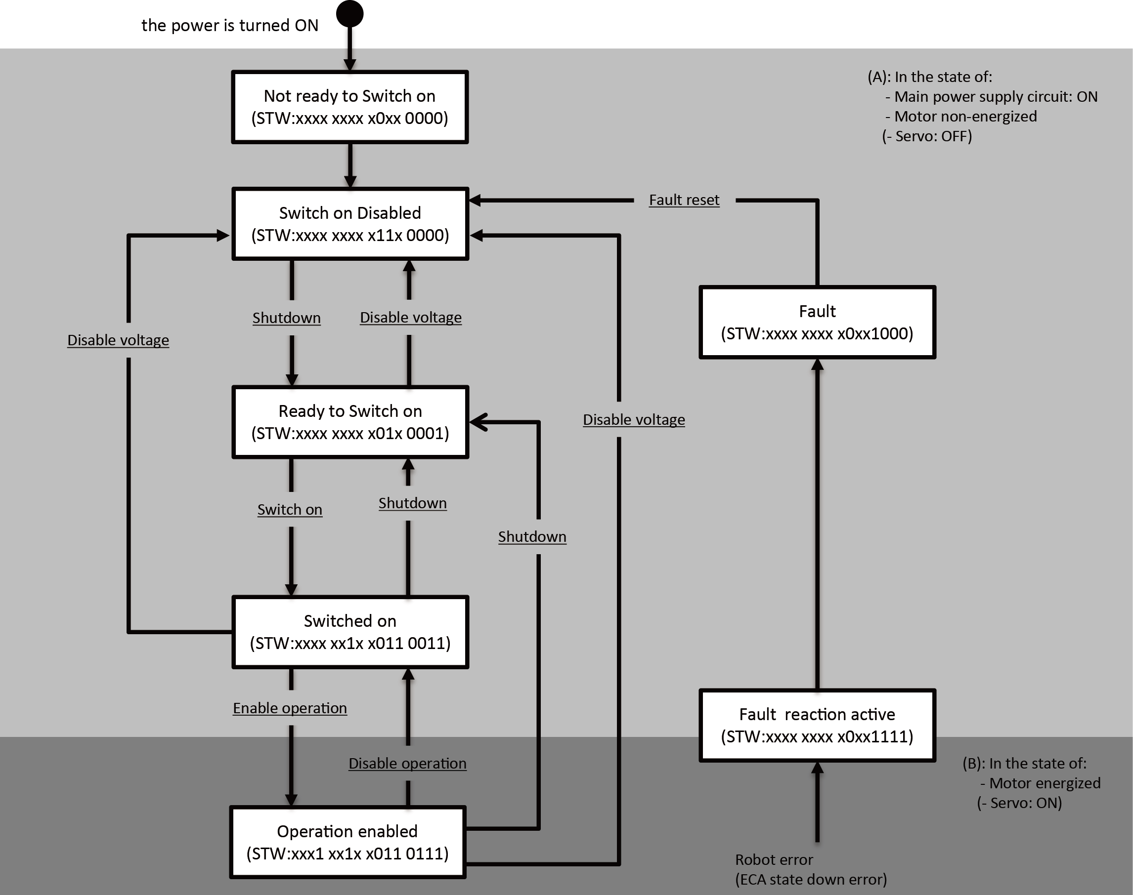 • The under lines of each words perform as the control command of Controlword(J1)-(J8) (Index:0x6040,0x6840,0x7080,0x7880,0x8080,0x8880,0x9080,0x9880). All the joints' states can transition according to the changes of control command of only one joint, which is among the joints enabled at the "joint setting enabled/ disabled". (All the joints' statuses can transition according to the logical conjunction of Controlword at every joint.)