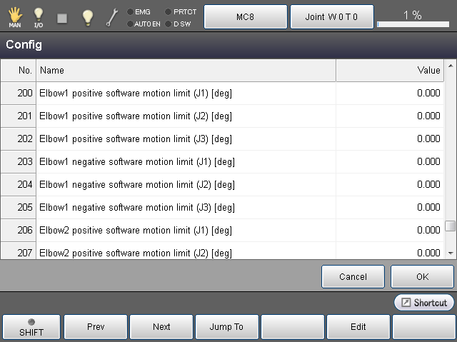 | 203 | Elbow 1 negative software motion limit (J1)[deg] |