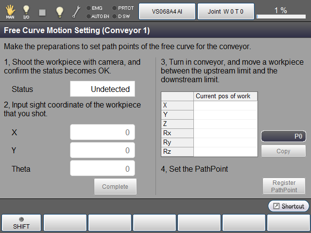 Press [Free curve motion] button of the conveyor to execute the free curve interpolation.