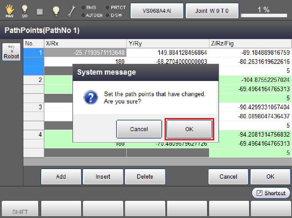 Move the robot to the teaching position on the [PathPoints] screen and press [Add].