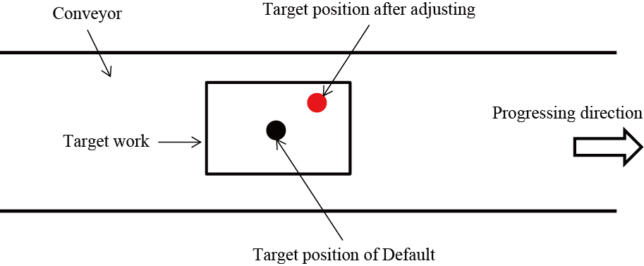 When adjust the target position or execute the relative motion while the conveyor tracking is operating, specify the offset value with the command of TrackShiftTarget or TrackDraw. This offset value at that time can be specified in the conveyor coordinates.