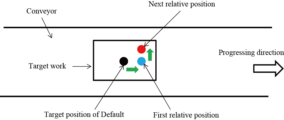 This exemplifies that a robot moves the target position of Default by using TrackMove and moves 5mm to Conveyor vector by using TrackDraw. Then the robot moves 10mm offset point towards the width direction of the conveyor by using TrackDraw.