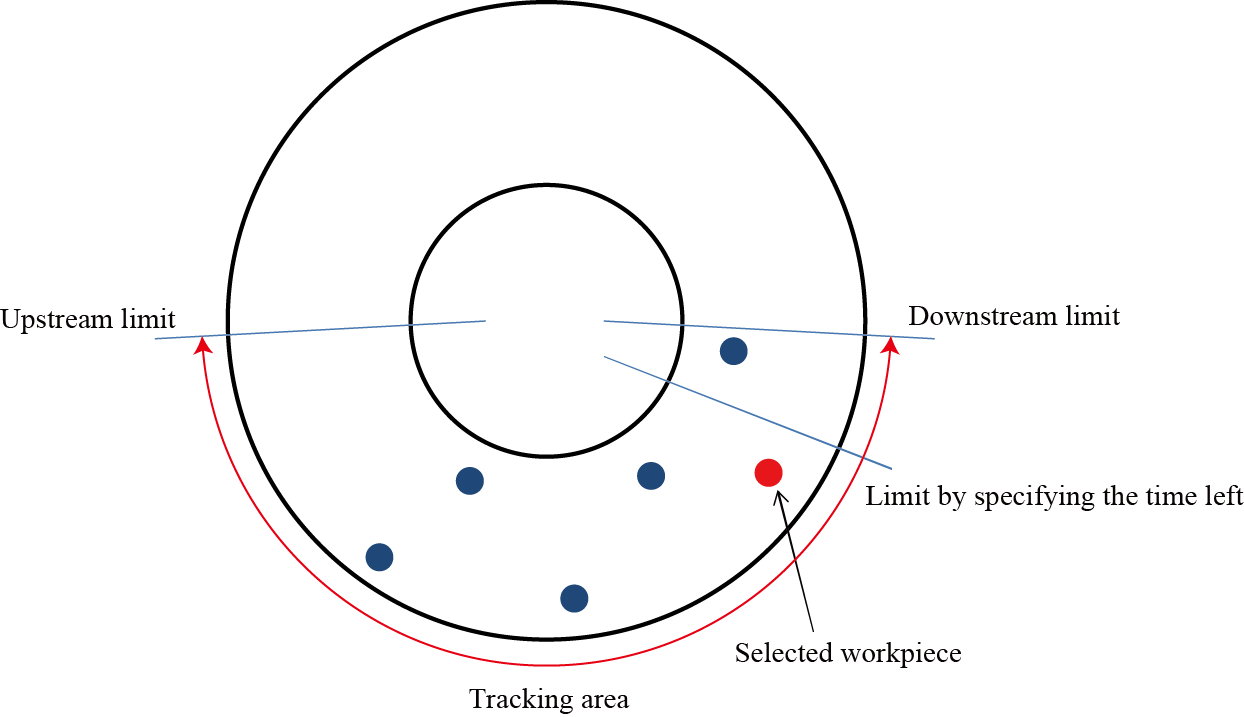 To prevent this error in advance, specify the time left to downstream limit with TrackTargetPos and do not select the workpiece that is close to the downstream limit as an object workpiece. (This function is available in Ver.2.3.* or higher.)