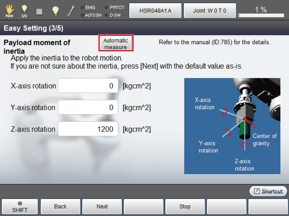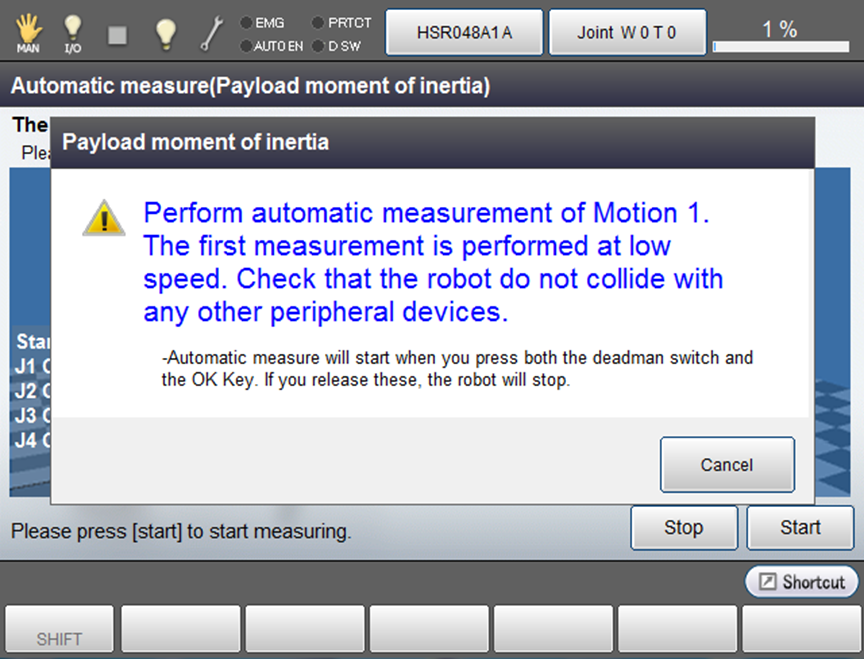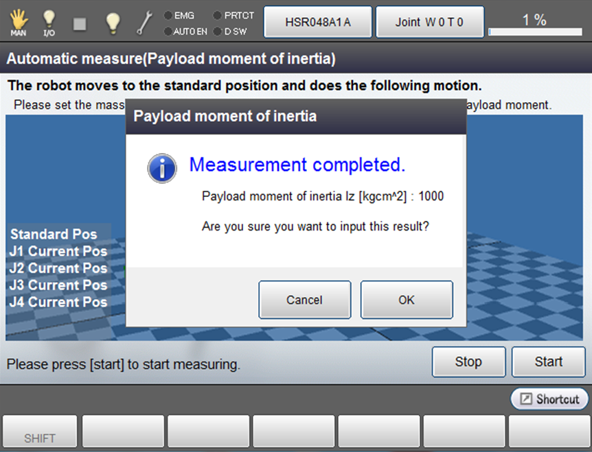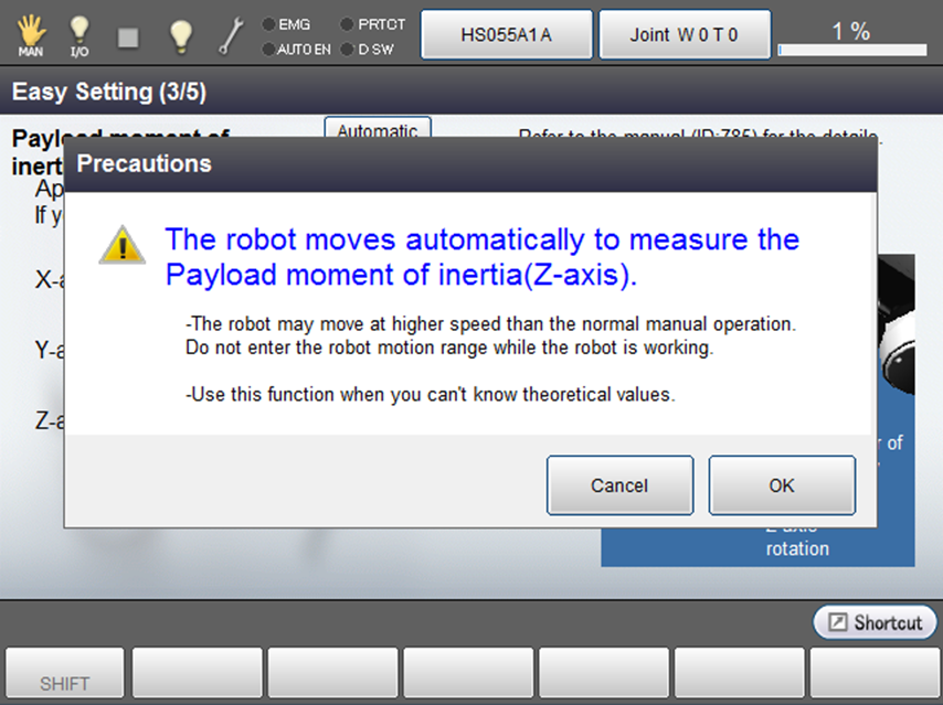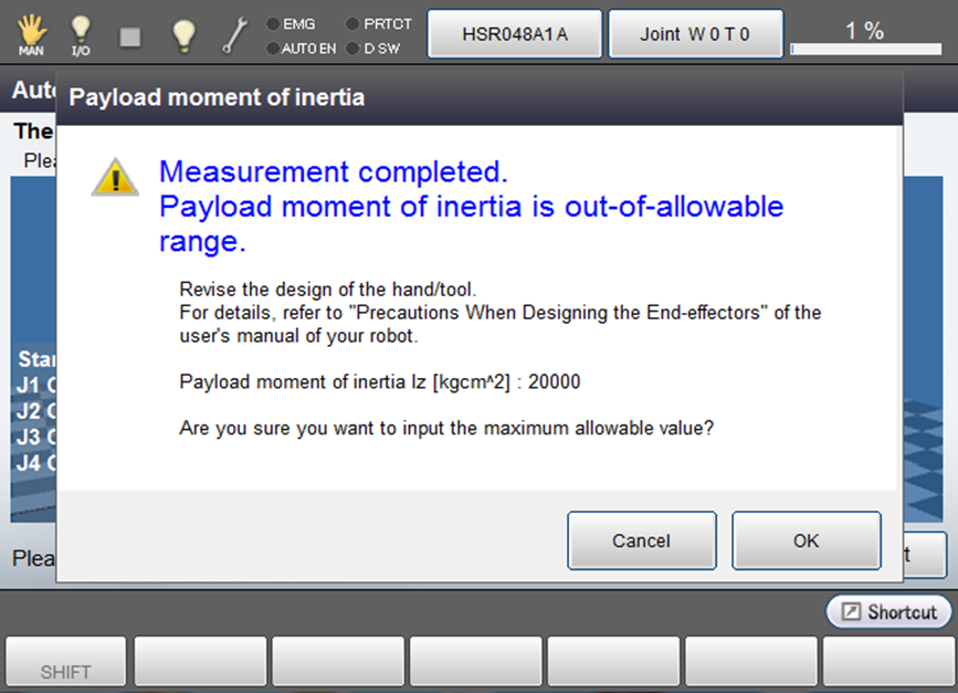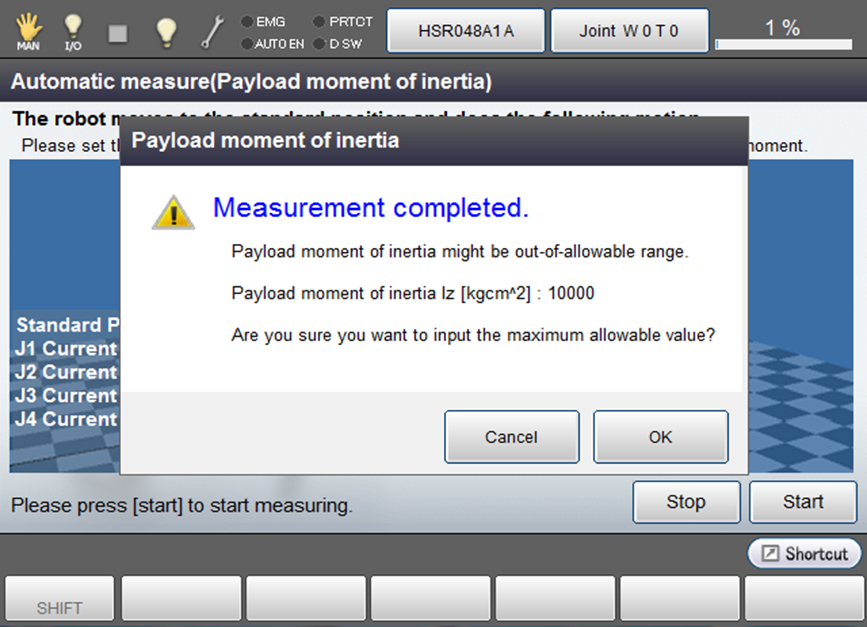 | 3 | Ensure that if pressed "Cancel" in the window of Automatic measurement and the window returns to [Easy Setting] - [Mass of payload], the measurement value cannot be inputted. |