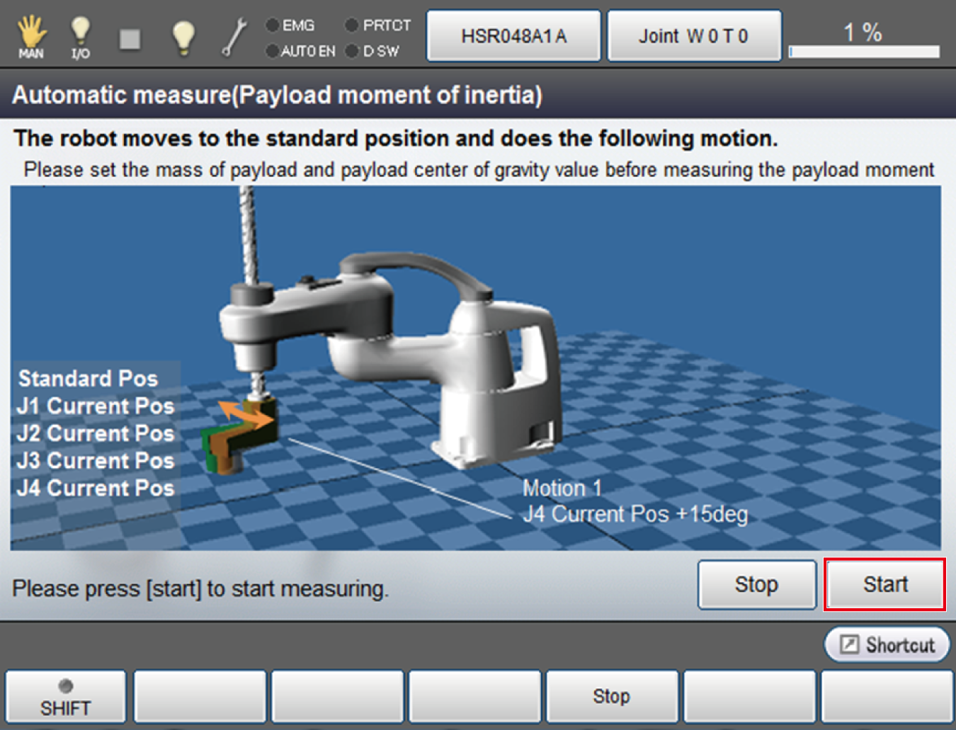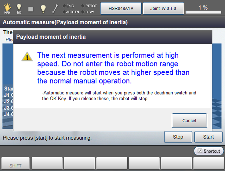 Information of how a robot performs and caution about measuring will be shown in the window of Payload moment of inertia.