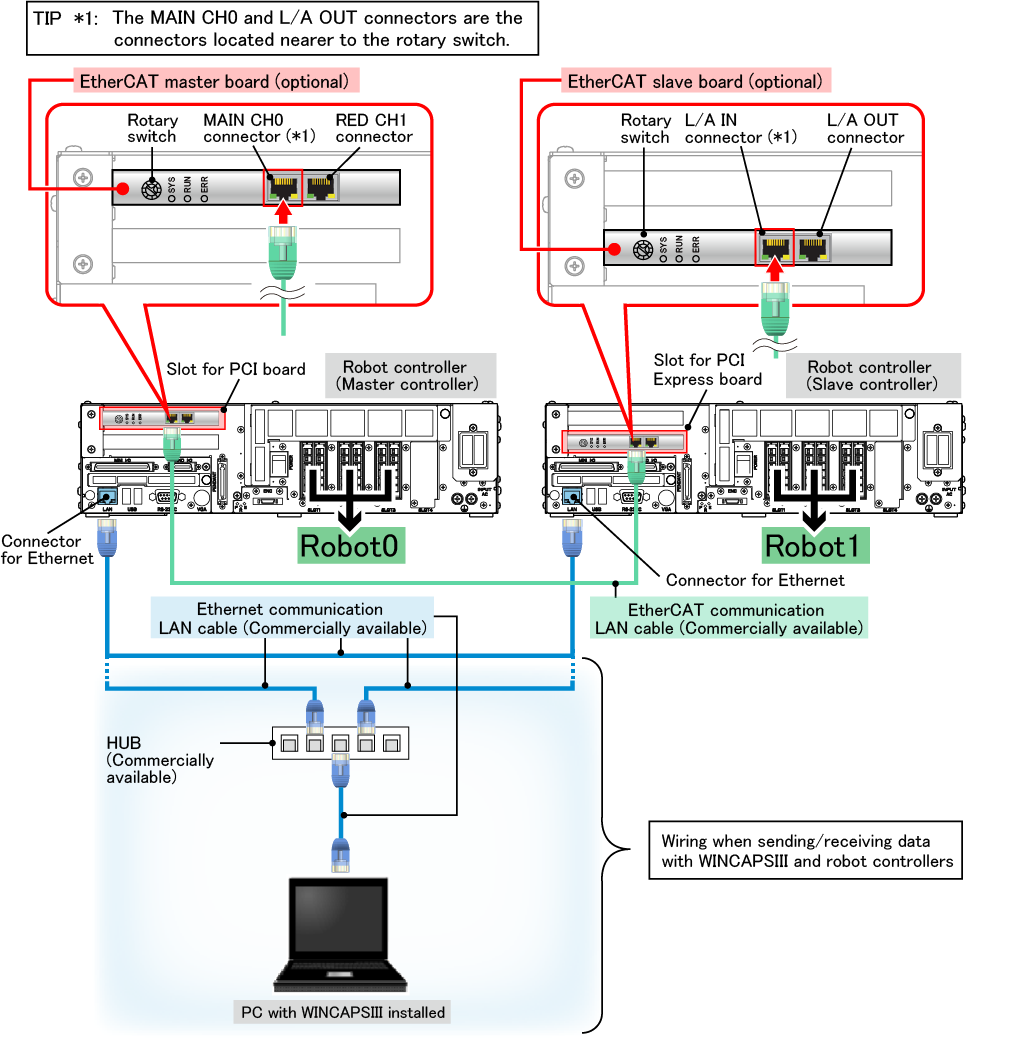 When the system for the cooperative control function is adjusted, data is sent/received between WINCAPSIII and a master controller, and also between WINCAPSIII and a slave controller as well. In this case, a PC with WINCAPSIII installed and the master and slave controllers must be all connected. Therefore, wire them as shown above. |