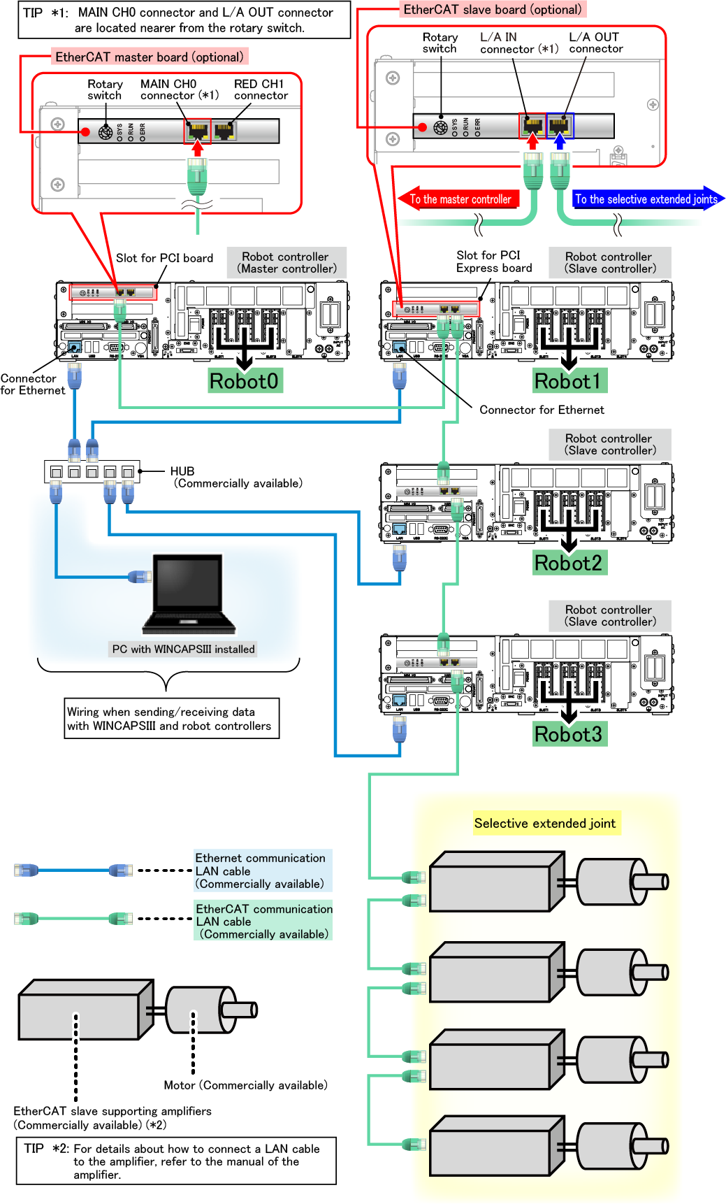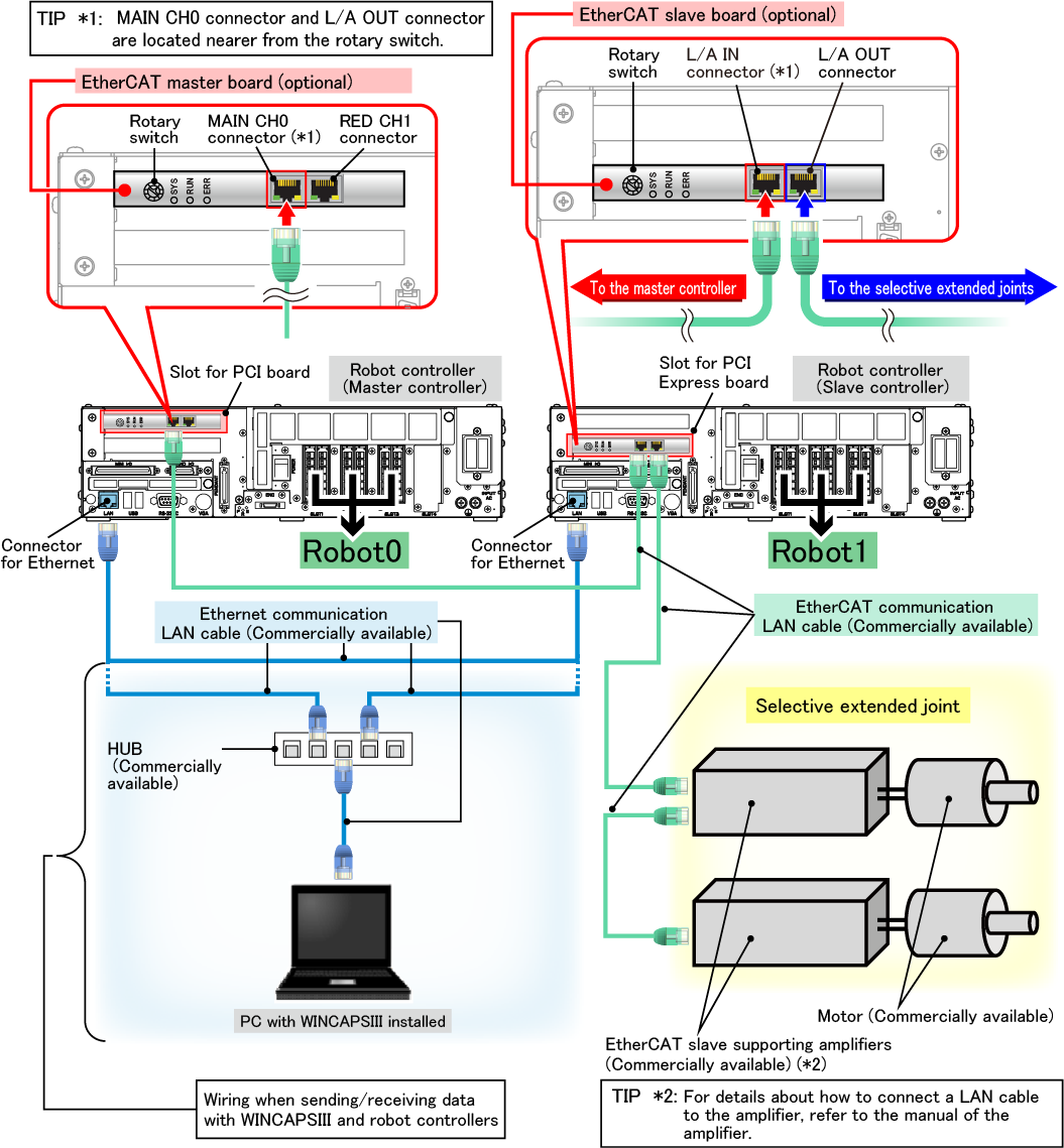 - Be sure to wire a device connected to the EtherCAT master board to the EtherCAT slave board. If selective extended joints and the EtherCAT master board are connected and the EtherCAT slave board is connected from the selective extended joints, the robot does not work properly.