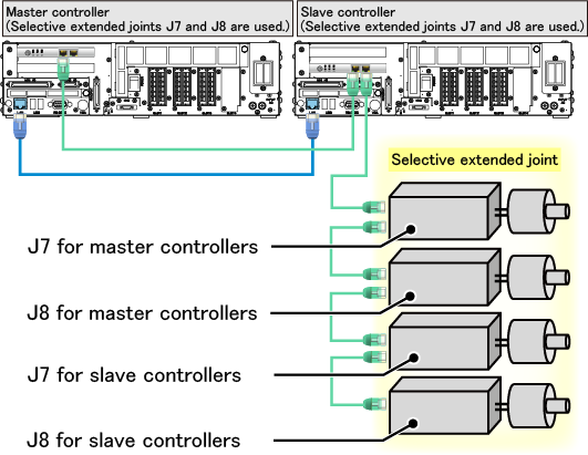 | If selective extended joints J7 and J8 are used for the master and slave controllers respectively, wiring is as shown in the right figure. | ![]() |