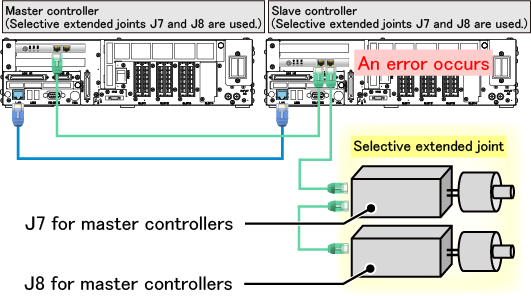 | When two selective extended joints are needed for the master and slave controllers respectively (a total of four), if only two are connected, an error occurs as shown in the right figure. | ![]() |
