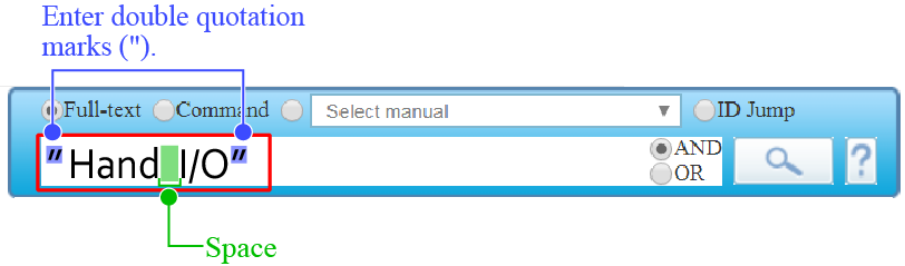 If a search string includes a space, the space is deemed as a string delimiter. As a result, the search string is divided into several words and searched (AND/OR search). To search a text string that includes spaces, enclose the text string with double quotation marks (“) so that spaces are not deemed as string delimiters.