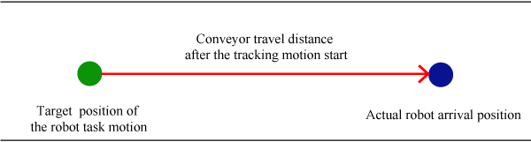 - The actual robot arrival position will be the position where the target position of the robot task motion is offset by the conveyor travel distance from the start and end of the tracking motion. This offset will be reset by executing TrackStop.