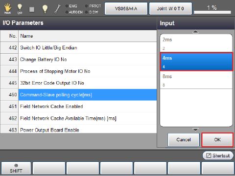 On the [I/O Parameters] window, select [460: Command-Slave polling cycle [ms]], and then press [F5 Edit].