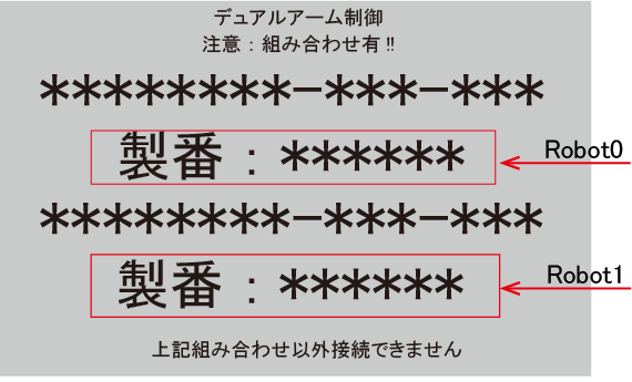 Robot allocation (which robot is allocated to Robot0 or Robot1) is written in the caution label of the package box and the controller setting list on the top surface of the robot controller.