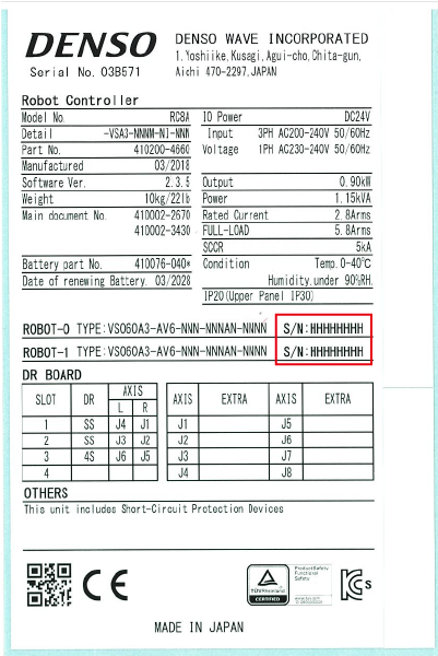 Controller setting list is attached on the top surface of the robot controller. Serial numbers of Robot0 and Robot1 are written in the part enclosed by the red rectangle in the following figure.